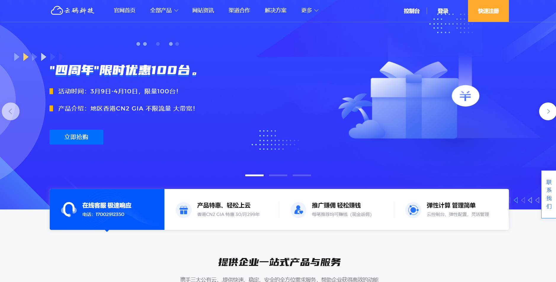 云码科技,原为云米科技,于2022年元旦正式更名,成立于2018年,目前已经稳定服务超过2000余名用户,提供了优质的云服务器服务,目前我司的年付用户已经超过300人,以产品质量优秀,售后服务及时,支持按天退款等优质服务,受到了广大用户的青睐。本次带来的优惠是:香港CN2 GIA 大带宽不限流量云服务器,月付最低仅需33元/月,需要的用户可以关注一下!