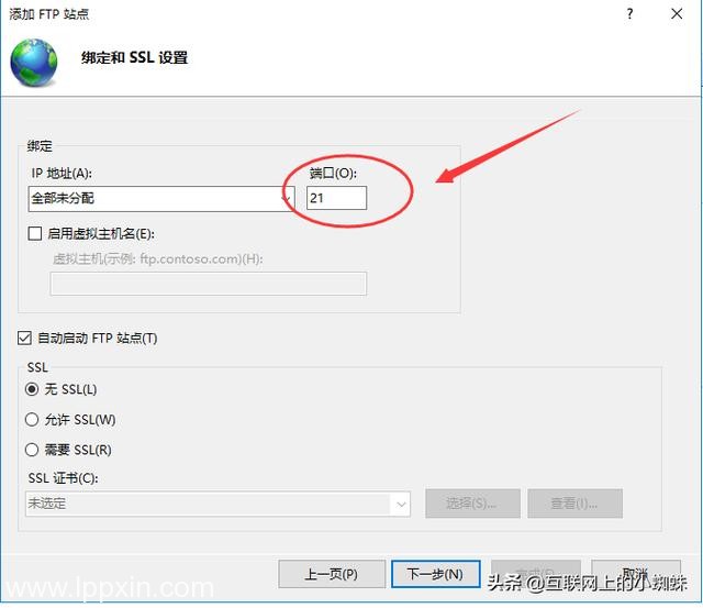 进入IP地址的设置,如果你需要选择指定的IP地址,可以在IP地址下面点开看到本机的IP地址列表,选择需要的设置的IP地址即可。这样只有你选定的IP地址方可访问该FTP服务器。后面可以进行端口号的设定,默认的端口号为21,出于安全方面的考虑,建议将该端口号改为其他。