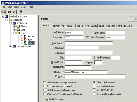 ⑤增加邮件用户。打开相应的邮件服务器,选“Users→右键→Add users”,可增加邮件用户;并可修改初始密码等资料。如下图: