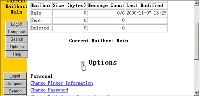 2、本文以8383端口为例。注意,刚进入主屏幕的时候,信箱链接是不可用的,如下图所示;要用Web方式接收邮件,必须要先给相应用户发至少一封信,见后文。