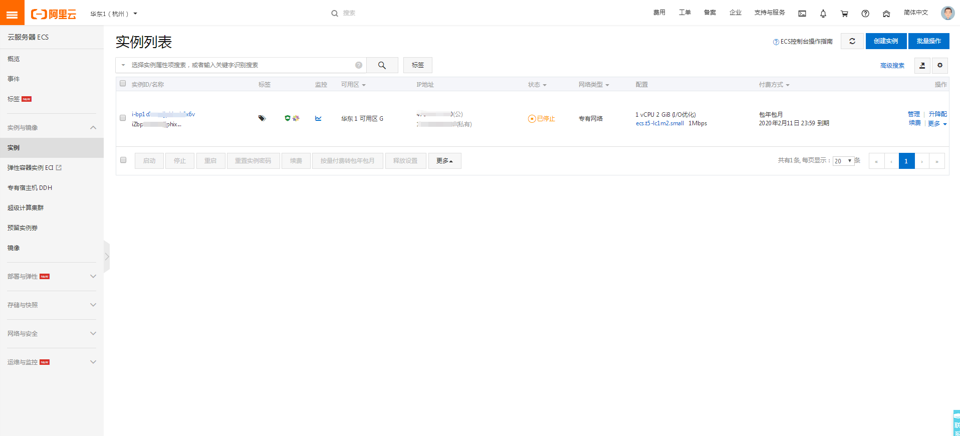 点击实例,在左上角选择区域(一定要选对地域才能看到服务器),这时看到服务器信息了,如图: