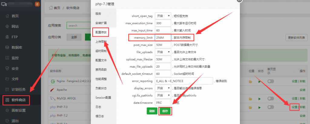 配置方法:登录宝塔面板,在左侧导航菜单点击【 软件管理 】,找到您正在使用的 php 版本,点击右侧的 【设置】 ,进入php 管理界面,在php管理界面点击左侧的【 配置修改 】,把 memory_limit 脚本内存限制修改成 256M,然后保存即可。