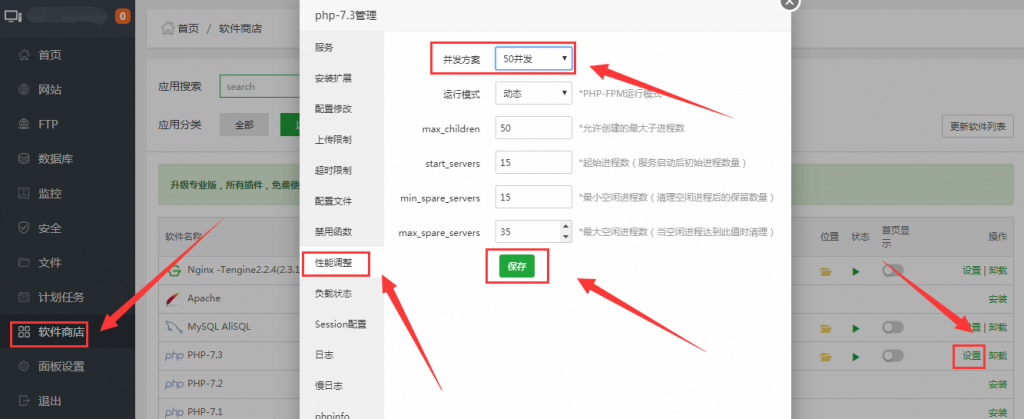 设置方法:登录宝塔面板,在左侧导航菜单点击【 软件管理 】,找到您正在使用的 php 版本,点击右侧的【设置 】,进入php 管理界面,在php管理界面点击左侧的 【性能调整】,选择并发方案,然后保存即可。