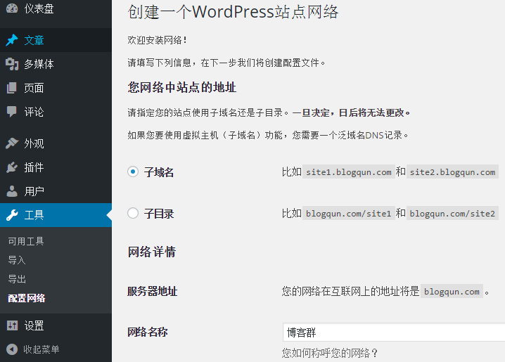 3、进入WordPress后台,”工具”-> 点击”配置网络”