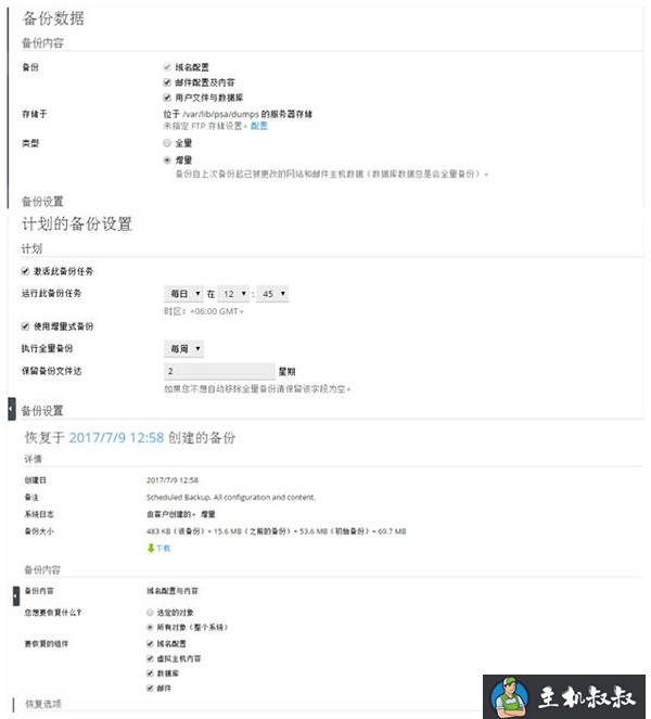 Plesk内置备份管理器,支持备份单个订阅、单个帐户和整台服务器上的数据。Plesk支持全量、增量两种备份方式,首次全量备份后续增量备份,既能够保障数据的连续性和完整性又可节省时间、空间。Plesk支持Plesk服务器和FTP远程服务器双存储,双重保障。通过Plesk还可计划备份,事先进行相应设置,备份管理器则按时按要求做好备份。要恢复备份也相当方便快捷,选定要恢复的内容,点击恢复即可。