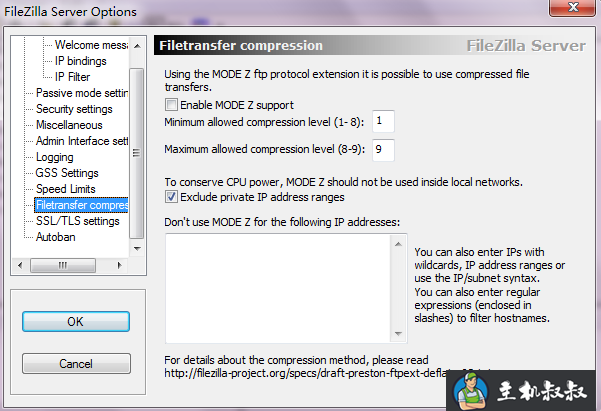 勾选“enable mode z support”就可以启用本服务器的mode z支持功能,这样,只要客户端也支持mode z就可以获得它带来的性能提升。“minimum allowed compression level”和“maximum allowed compression level”分别设置最小压缩率和最大压缩率。最下面可以输入不启用mode z功能的目标ip。