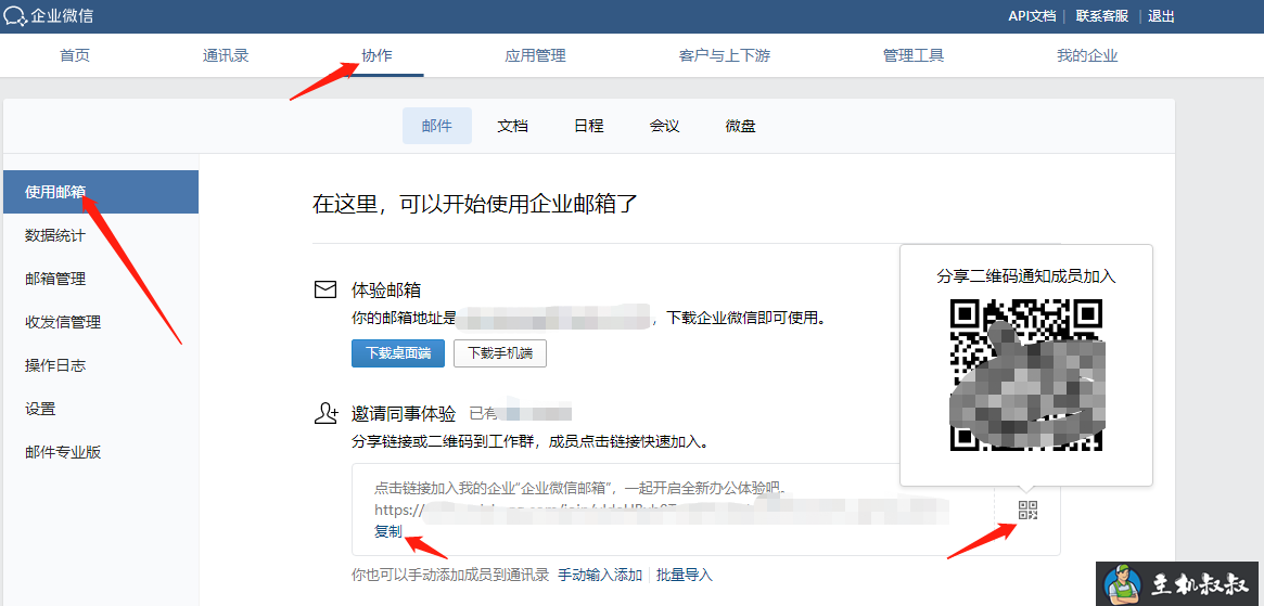 方式二:管理员分享二维码或链接方式邀请成员加入。管理员在企业微信后台—通讯录—微信邀请或者是企业微信后台—协作—使用邮箱—邀请同事体验,分享二维码或链接至内部沟通群等方式,员工点击加入成功后,通过企业微信后台—通讯录找到加入的成员账号为其补全手机号码信息。